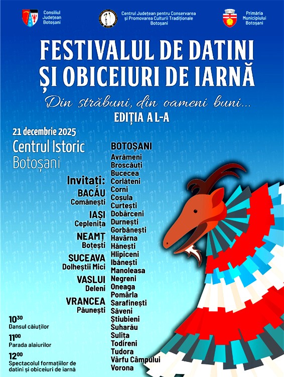 Centrul Județean pentru Conservarea și Promovarea Culturii Tradiționale Botoșani, instituție publică de cultură aflată în subordinea Consiliului Județean Botoșani, vă invită duminică, 21 decembrie 2025, la ediția a L-a, aniversară, a Festivalului de Datini și Obiceiuri de Iarnă „Din străbuni, din oameni buni…”, desfășurată în Centrul Istoric al Botoșaniului.