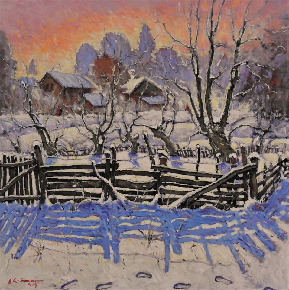 D.C.: Am mai dezvoltat acest subiect într-una din cele două cărți pe care le-am scris, însă pentru cititorii publicației de față, voi relua povestea pe scurt. Așadar, întorcându-mă în copilărie, mi-aduc aminte că primul impuls spre a desena a fost acela când, copil fiind, mergând deja spre șase ani, într-o iarnă năpraznică, un om din sat a venit pe la noi cu treabă. După ce a stat de vorbă cu tata, ne-a întrebat pe mine și pe una dintre surori, dacă suntem cuminți, dacă ascultăm de părinți și mai ales dacă nu coborâm de pe cuptorul cald pe dușumeaua rece din lut galben acoperită ici colo cu câte un țolișor (covoraș) țărănesc țesut de bunica la stative. Mama, dar și bunica, nu ne lăsau pe jos fiindcă era frig și răceam foarte ușor, de aceea trebuia, cât era ziua de lungă, să stăm acolo, sus pe cuptor, unde nu prea aveam ce face, decât să privim pe fereastră cum cad fulgii de nea. Îmi plăcea această cădere necontenită a zăpezii, nu știu de ce și nici nu mă întrebam…