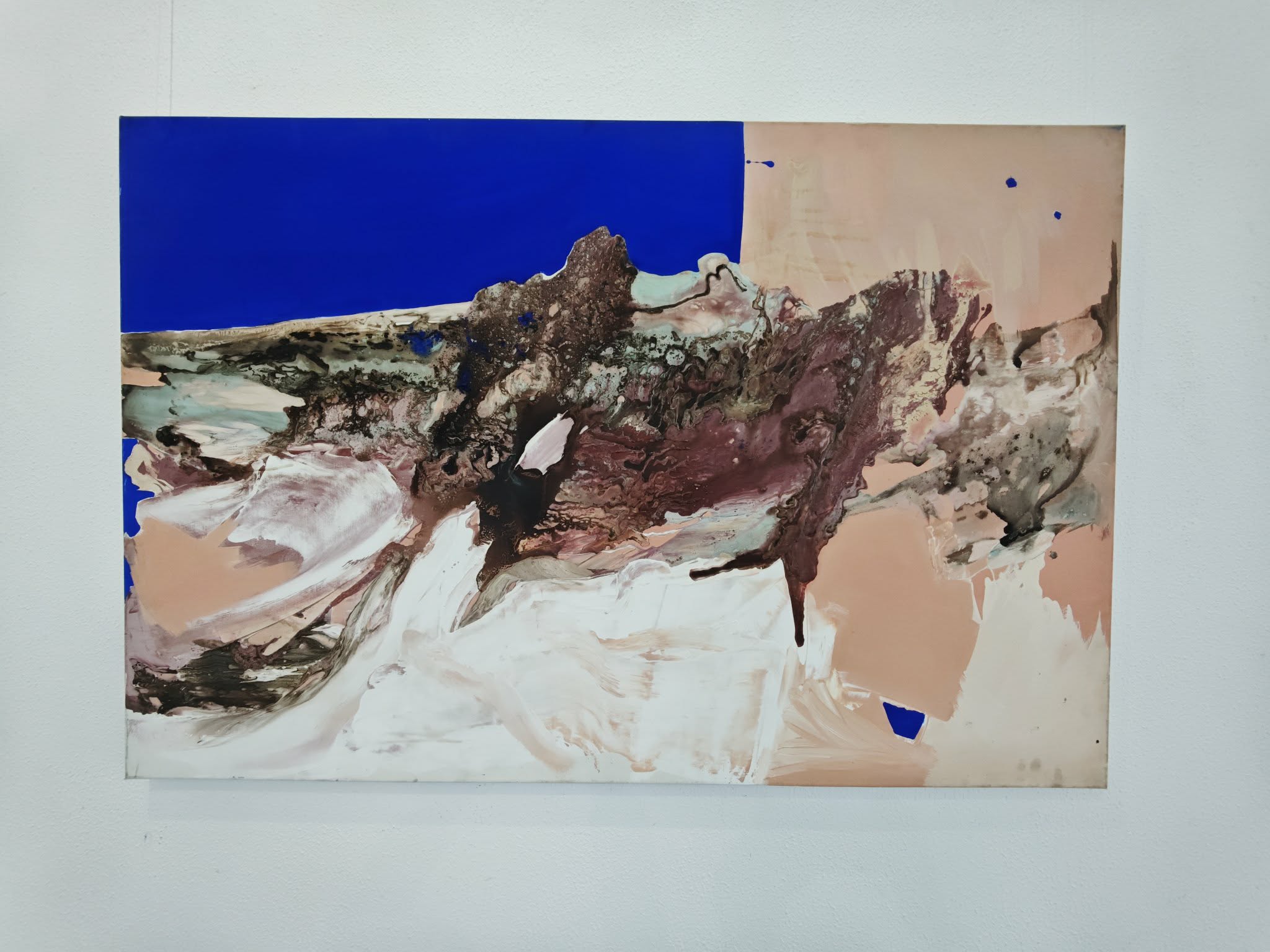 Această descriere indică o practică situată la granița dintre pictură și experiment material. Reacția chimică, sedimentarea, transparența devin factori activi ai compoziției. Imaginea nu este ilustrativă, ci rezultatul unei negocieri între gest și proces.