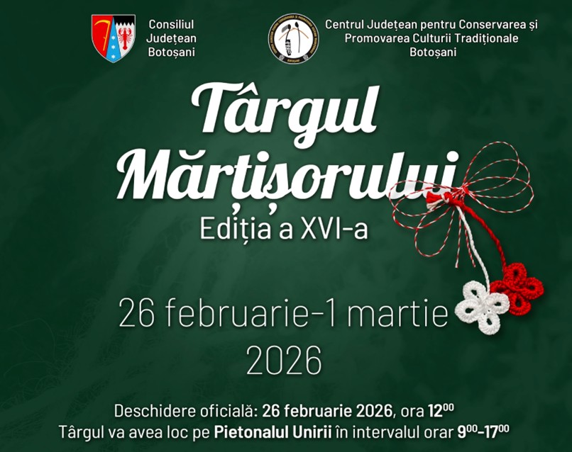 Centrul Judeţean pentru Conservarea şi Promovarea Culturii Tradiţionale Botoşani, instituție publică de cultură aflată în subordinea Consiliului Județean Botoșani, cu sprijinul Primăriei Municipiului Botoșani, organizează în perioada 26 februarie – 1 martie 2026, activitatea Târgul Mărțișorului care a ajuns la cea de-a XVI-a ediție.